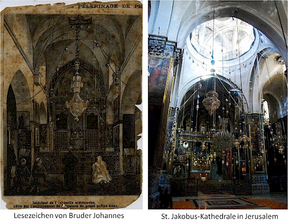 Mitten im Buch befindet sich ein Lesezeichen: Ein Ausschnitt aus einer Zeitung, welcher ein Bild des Innenraums einer Kirche darstellt. Weil an der unteren Seite des Bildes ein französischer Hinweis steht, konnte das Lesezeichen nun zugeordnet werden. Es handelt sich um die St. Jakobus-Kathedrale in Jerusalem. Dieses Lesezeichen hat Bruder Johanes begleitet, ähnlich unseren „Bildchen“ im Gesangbuch.